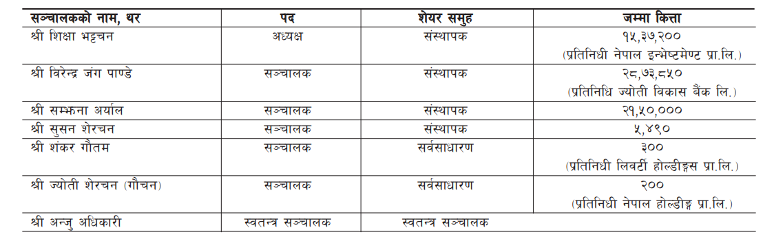 सञ्चालक समिति अध्यक्ष शिक्षा भट्टचनको नाममा १५ लाख ३७ हजार कित्ता शेयर रहेको छ । साथै, सञचालक सम्झना अर्यालको नाममा २१ लाख ५० हजार कित्ता, सर्वसाधारण समुहका सञ्चालक शंकर गौतमको तीन सय कित्ता शेयर रहेको छ ।