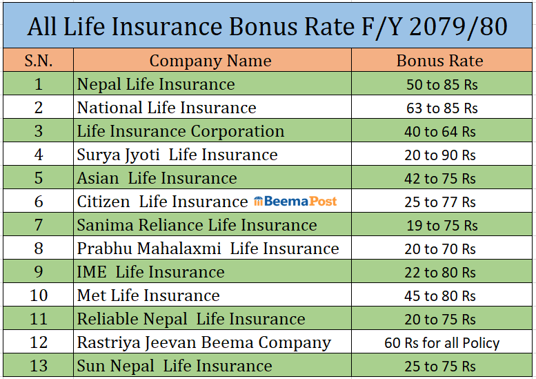नेपाल लाइफ इन्स्योरेन्सले यो बर्षको बोनसदर घोषणा गरिसकेकोछ । कम्पनीले न्यूनतम ५० रुपैयाँदेखि ८५ रुपैयाँ सम्म बोनसदर निर्धारण गरेको छ।