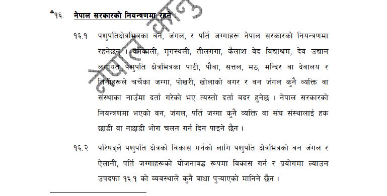 पशुपतिनाथ गुठीको ९ रोपनी ९ आना जग्गा पशुपति क्षेत्र विकास कोष ऐन २०५० अनुसार पशुपति क्षेत्र विकास कोषको संरक्षकत्वमा छ । जुन कोषको उद्देश्य परिपूर्ति बाहेक कसैले हकभोग वा चलन गर्न पाउँदैनन् भने ऐनले व्यवस्था गरेको पशुपति क्षेत्र विकास कोष सञ्चालक परिषदको स्वीकृतिविना कुनै प्रयोजनका लागि प्रयोग गर्न पाइँदैन ।
