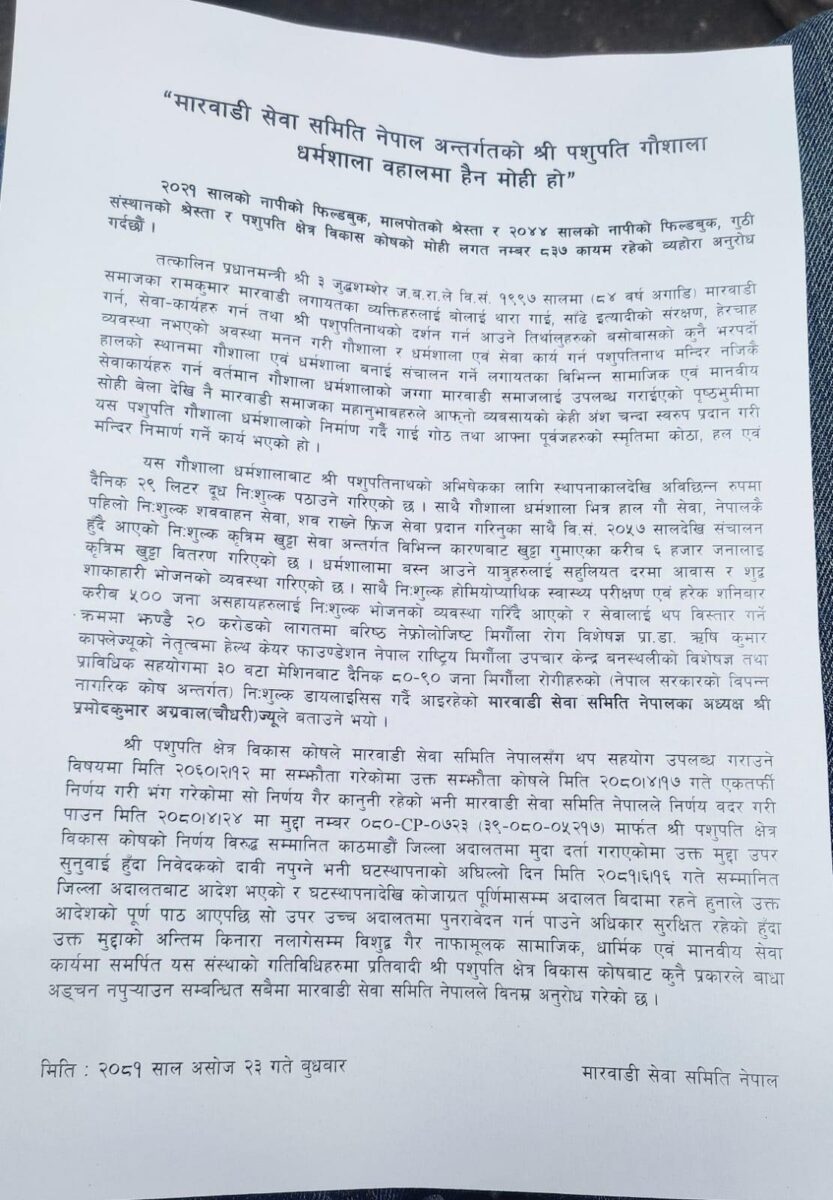 पशुपति क्षेत्र विकास कोष सञ्चालक परिषद्ले २०८० साउन १७ गते मारवाडी सेवा समितिसँग २०६० साल जेठ ९ गते भएको ९ बुँदे सम्झौता खारेज गरेपछि ‘करार रद्द गर्ने निर्णय बदर गरी यथावत् पुनर्वहाली गरिपाऊँ’ भनी समितिले जिल्ला अदालत काठमाडौंमा मुद्दा हालेको थियो ।