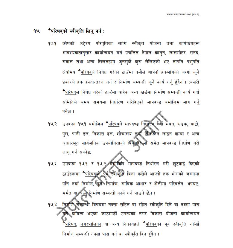 ऐनको दफा १७.४ मा निर्माण सम्बन्धी विषयमा नक्सासहित वा रहित स्वीकृति दिने वा नक्सा पास गर्न दायित्व भएका काठमाडौं उपत्यका नगर विकास योजना कार्यान्वयन परिषद, नगरपालिका वा अन्य निकायहरुले परिषदको पूर्व स्वीकृति नलिई निर्माण सम्बन्त्री नक्सा पास गर्न वा स्वीकृति दिनुहुँदैन भनी उल्लेख छ ।