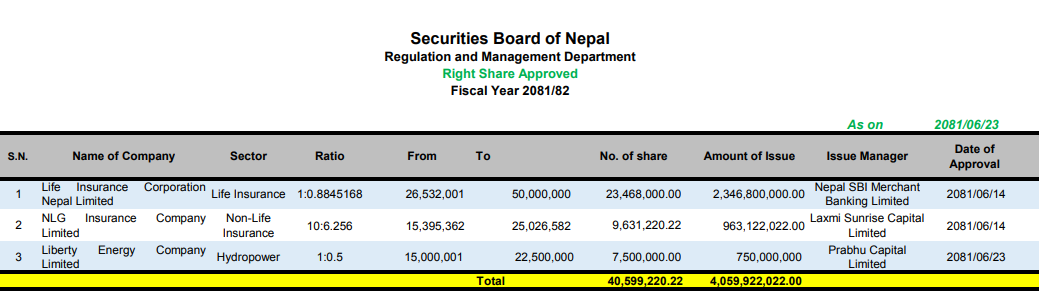 धितोपत्र बोर्डले यसअघि एनएलजी इन्स्योरेन्स र एलआइसी नेपाललाई पनि हकप्रद शेयर निष्काशनको अनुमति दिइसकेको छ ।