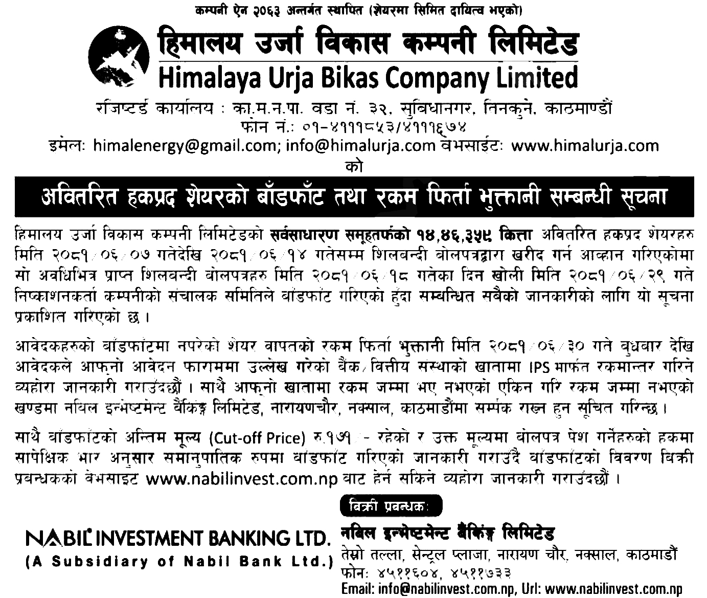 हिमालयन उर्जाको अवितरित हकप्रद बाँडफाँड, आजैदेखि रकम फिर्ता गरिने