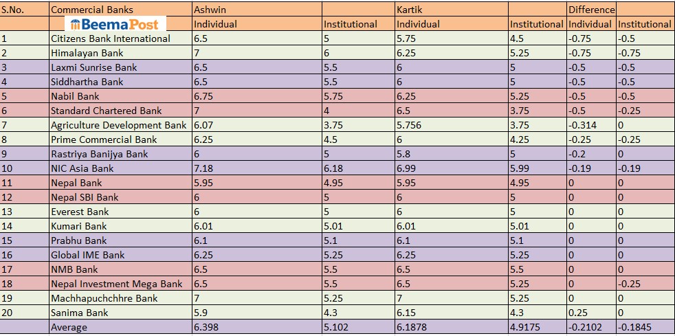 कात्तिक महिनाका लागि वाणिज्य बैंकहरुले घटायो ब्याजदर, कुन बैंकको ब्याजदर कति ?