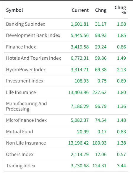 दशैँपछि शेयर बजारमा लगानीकर्ताहरु उत्साहित देखिएका छन् । बुधबार सबै उपसूचकहरुमा हरियाली छाएको छ । आज २०६ वटा कम्पनीहरुको शेयरमूल्य बृद्धि भएको छ ।