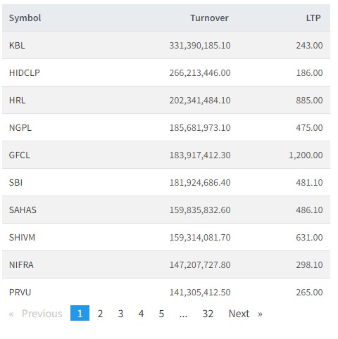 त्यस्तै, हाईड्रोइलेक्टेसिटि इन्भेष्टमेन्ट, हिमालयन रि, नेपाल एसबीआई बैंक, डाङी गुप्र, गुडबिल फाइनान्स, नेपाल एसबीआई बैंक, साहस उर्जा, शिवम सिमेन्टस, निफ्रा र प्रभु बैंकको सर्वाधिक कारोबार भएको छ।