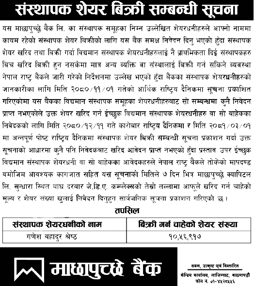 काठमाडौं । माछापुच्छ्रे बैंक लिमिटडले संस्थापक शेयर बिक्रीमा राखेको छ । बैंकले संस्थापक शेयरधनी गणेश बहादुर श्रेष्ठको नाममा रहेको १० लाख ५६ हजार ९१७ कित्ता शेयर बिक्रीमा राखेको हो ।