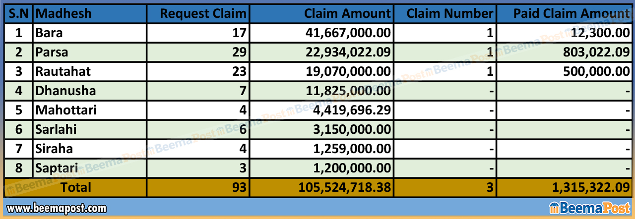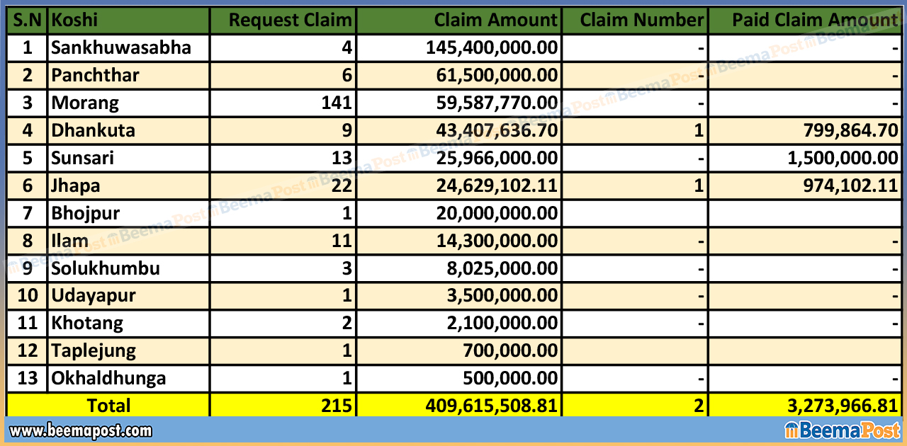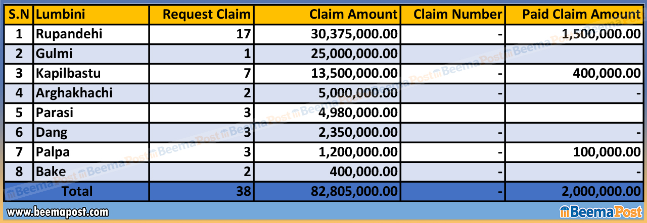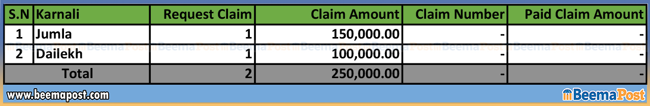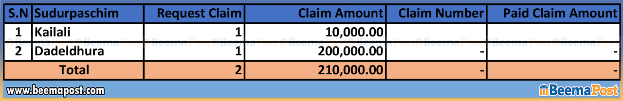 दैलेखमा १ लाख रुपैयाँ, तनहुँमा ५० हजार रुपैयाँ र कैलालीमा १० हजार रुपैयाँ बीमा दाबी परेको तथ्यांकमा उल्लेख रहेको छ।