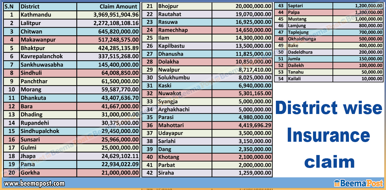 त्यस्तै, दैलेख, तनहुँ र कैलालीमा सबैभन्दा कम बीमा दाबी परेको प्राधिकरणको तथ्यांकले देखाएको छ ।