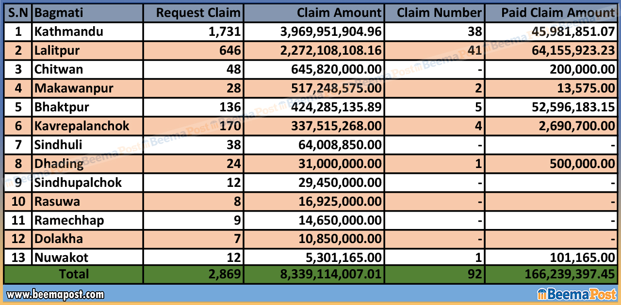 दोस्रोमा ललितपुर जिल्ला रहेको छ। ललितपुर जिल्लाबाट २ अर्ब २७ करोडको बीमा दाबी परेको छ।