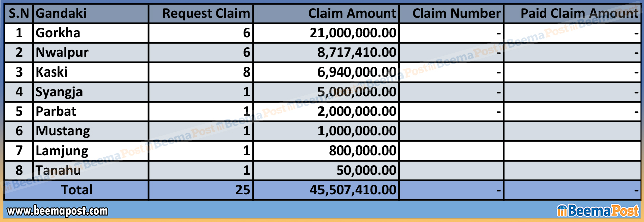 दैलेखमा १ लाख रुपैयाँ, तनहुँमा ५० हजार रुपैयाँ र कैलालीमा १० हजार रुपैयाँ बीमा दाबी परेको तथ्यांकमा उल्लेख रहेको छ।