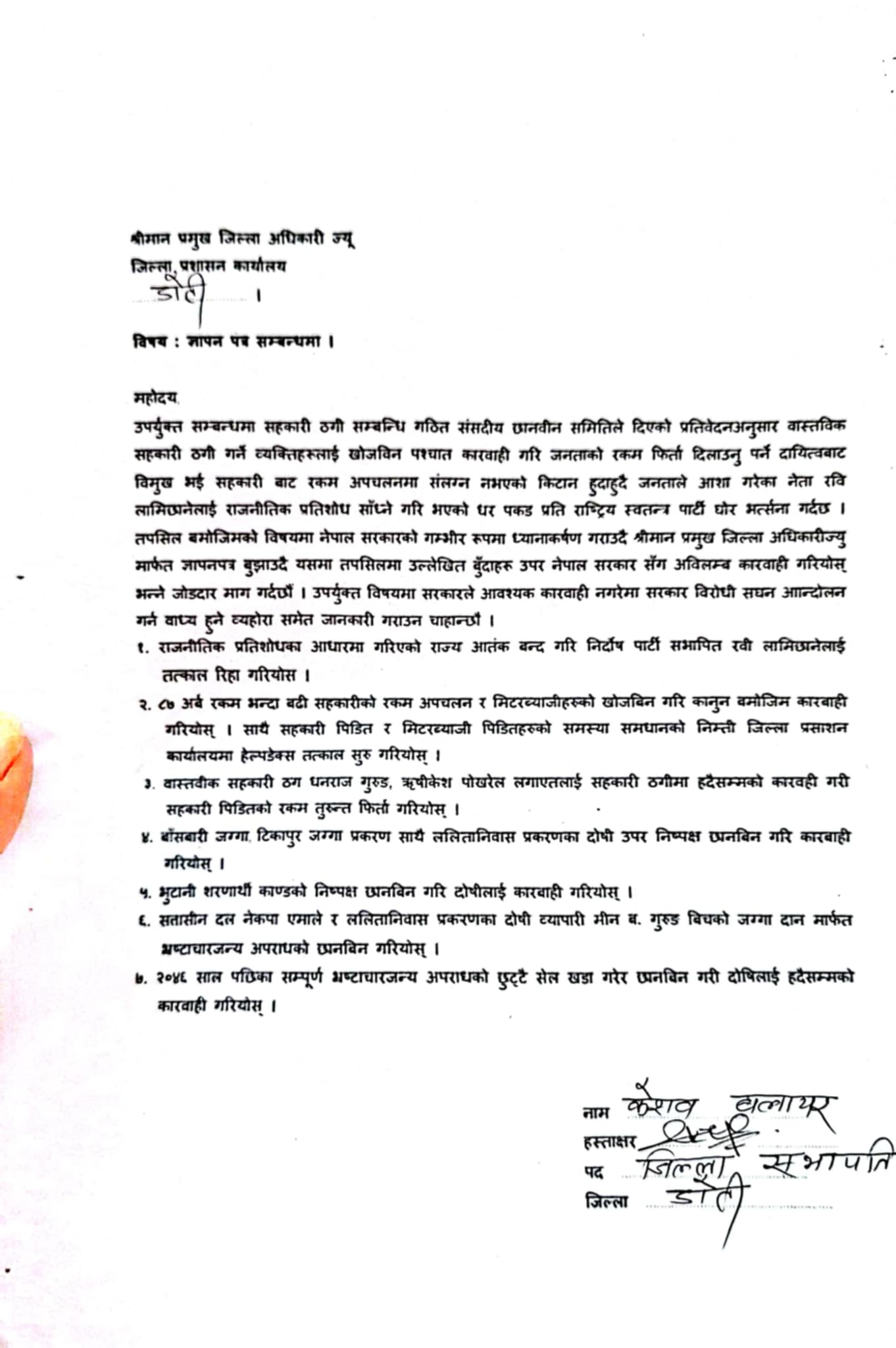 साथै, रास्वपा डोटीले बाँसबारी जग्गा, टिकापुर जग्गा प्रकरण, ललिता निवास र भुटानी शरणार्थी प्रकरणहरुमा ठोस कदम चाली दोषीलाई कारबाही गुर्न समेत माग गरेको छ ।