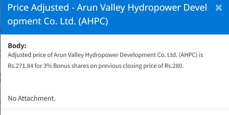 आइतबार कम्पनीले प्रस्तावित गरेको ३ प्रतिशत बोनश शेयरको शेयरमूल्य समायोजन भएको छ । नेप्सेले कारोबार अघिको शेयरमूल्य २८० रुपैयाँका आधारमा समायोजन गरेको हो ।