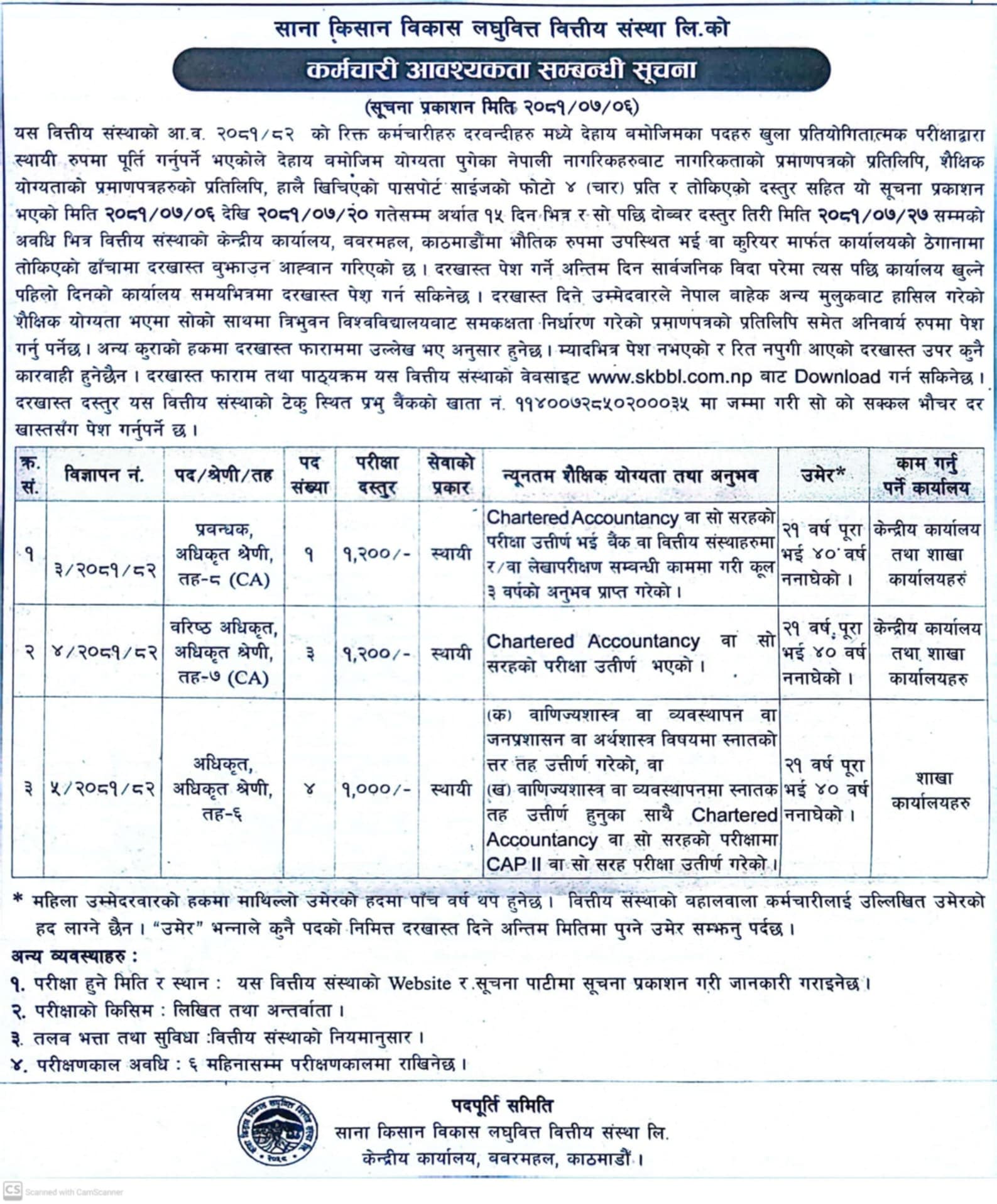 काठमाडौं । साना किसान विकास लघुवित्त वित्तीय संस्था लिमिटेडले विभिन्न पदमा ८ जना कर्मचारी माग गरेको छ । कम्पनीले खुला प्रतिस्पर्धाद्वारा स्थायी पदपूर्ति गर्ने गरी दरखास्त आह्वान गरेको हो ।
