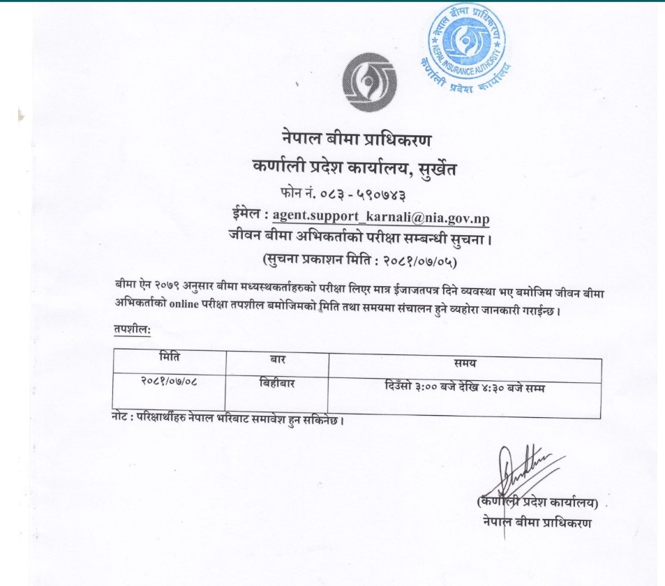 काठमाडौं । नेपाल बीमा प्राधिकरण कर्णाली प्रदेश कार्यालयले जीवन बीमा अभिकर्ताको परीक्षा सञ्चालन गर्ने भएको छ । बीमा प्राधिकरण कर्णाली प्रदेश कार्यालयले एक सूचना प्रकाशित गर्दै अनलाइन माध्यमबाट कात्तिक ८ गते दिउँसो ३ बजेदेखि ४ः३० बजेसम्म परीक्षा सञ्चालन गर्ने भएको हो ।