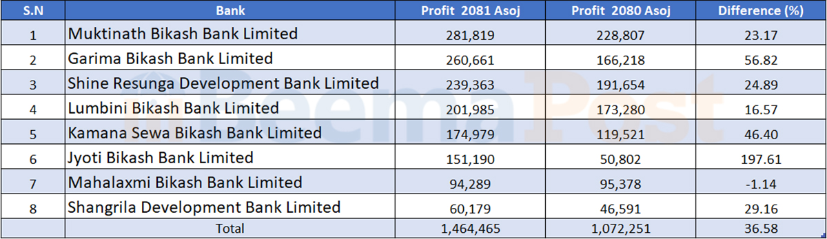 समिक्षा अवधिमा गरिमा विकास बैंकको नाफा ५६.८२ प्रतिशतले बढेर २६ करोड ६ लाख रुपैयाँ, शाइन रेसुङ्गाको २४.८९ प्रतिशतले बढेर २३ करोड ९३ लाख रुपैयाँ, लुम्बिनी विकास बैंकको १६.५७ प्रतिशतले बढेर २० करोड १९ लाख रुपैयाँ, कामना सेवा विकास बैंकको ४६.४० प्रतिशतले बढेर १७ करोड ४९ लाख रुपैयाँ र सांग्रिला डेभलपमेन्ट बैंकको २९.१६ प्रतिशतले बढेर ६ करोड १ लाख रुपैयाँ पुगेको छ ।