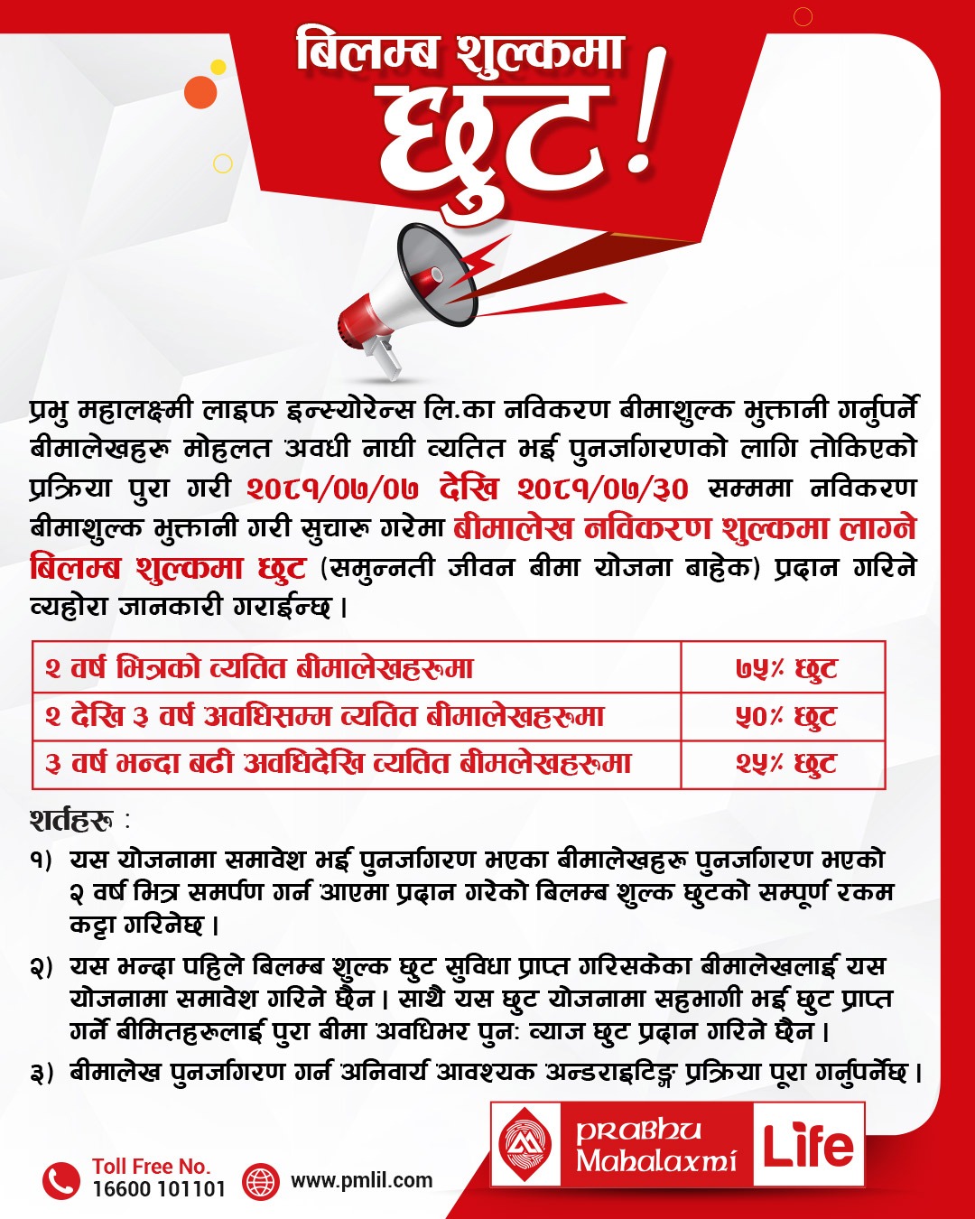 काठमाडौं । प्रभु महालक्ष्मी लाइफ इन्स्योरेन्स कम्पनी लिमिटेडले ब्यतित बीमालेखहरु नविकरण गराउँदा लाग्ने बिलम्ब शुल्कमा छुट प्रदान गरेको छ । उक्त छुट सुविधा आज अर्थात कात्तिक ७ गतेदेखि ३० गतेसम्म लागु हुनेछ ।