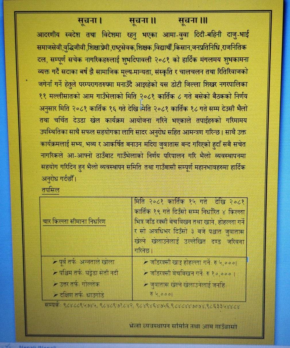 गाउँभेलाले कात्तिक ८ गते बसेको बेंठकको निर्णय अनुसार कात्तिक १६ देखि १८ गतेसम्म देउसी भैलो तथा चर्चित देउडा खेल कार्यक्रम आयोजना हुनेछ। यस अवसरमा कार्यक्रमलाई सभ्य, भव्य र आकर्षक बनाउने उद्देश्यले जाँड, रक्सी, जुवातासलगायत अनुशासनहीन गतिविधि निषेध गरिएको छ।