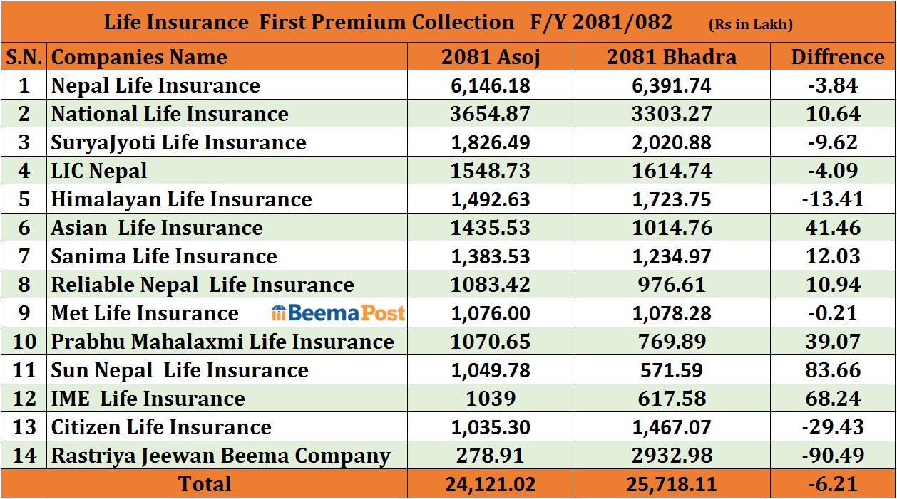 असोज महिनामा नेपाल लाइफले सर्वाधिक ६१ करोड ४६ लाख रुपैयाँ प्रथम बीमाशुल्क आर्जन गरेको छ । दोस्रोमा नेशनल लाइफले ३६ करोड ५४ लाख रुपैयाँ, तेस्रोमा सूर्यज्योति लाइफले १८ करोड २६ लाख रुपैयाँ र चौथोमा एलआईसी नेपालले १५ करोड ४८ लाख रुपैयाँ प्रथम बीमाशुल्क आर्जन गरेको छ ।