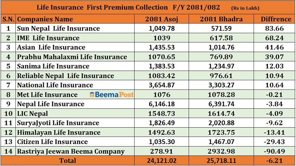 बाँकी ७ वटा कम्पनीहरूको भने भदौको तुलनामा असोजमा प्रथम बीमाशुल्क आर्जन घटेको छ । जसमा मेट लाइफको ०.२१ प्रतिशत, नेपाल लाइफको ३.८४ प्रतिशत, एलआईसी नेपालको ४.०९ प्रतिशत, सूर्यज्योति लाइफको ९.६२ प्रतिशत, हिमालयन लाइफको १३.४१ प्रतिशत, सिटिजन लाइफको २९.४३ प्रतिशत र राष्ट्रिय जीवन बीमा कम्पनीको ९०.४९ प्रतिशतले प्रथम बीमाशुल्क आर्जन घटेको छ ।