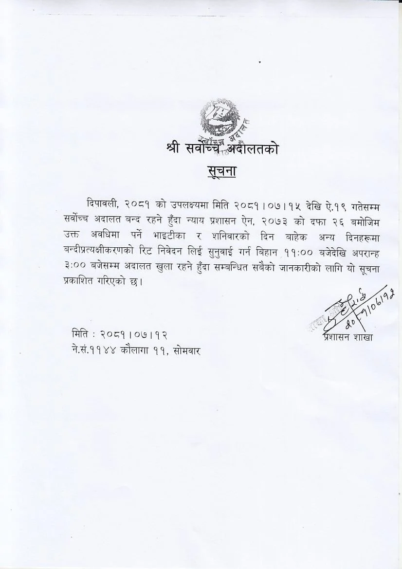 सर्वोच्च अदालतको प्रशासन शाखाले सोमबार एक सूचना जारी गर्दै, अदालत बन्द भए पनि न्याय प्रशासन ऐन, २०७३ को धारा २६ अनुसार उक्त अवधिमा पर्ने भाइटीका र शनिबार बाहेकका अन्य दिनहरूमा बन्दी प्रत्यक्षीकरण रिटको सुनुवाइ हुनेछ।