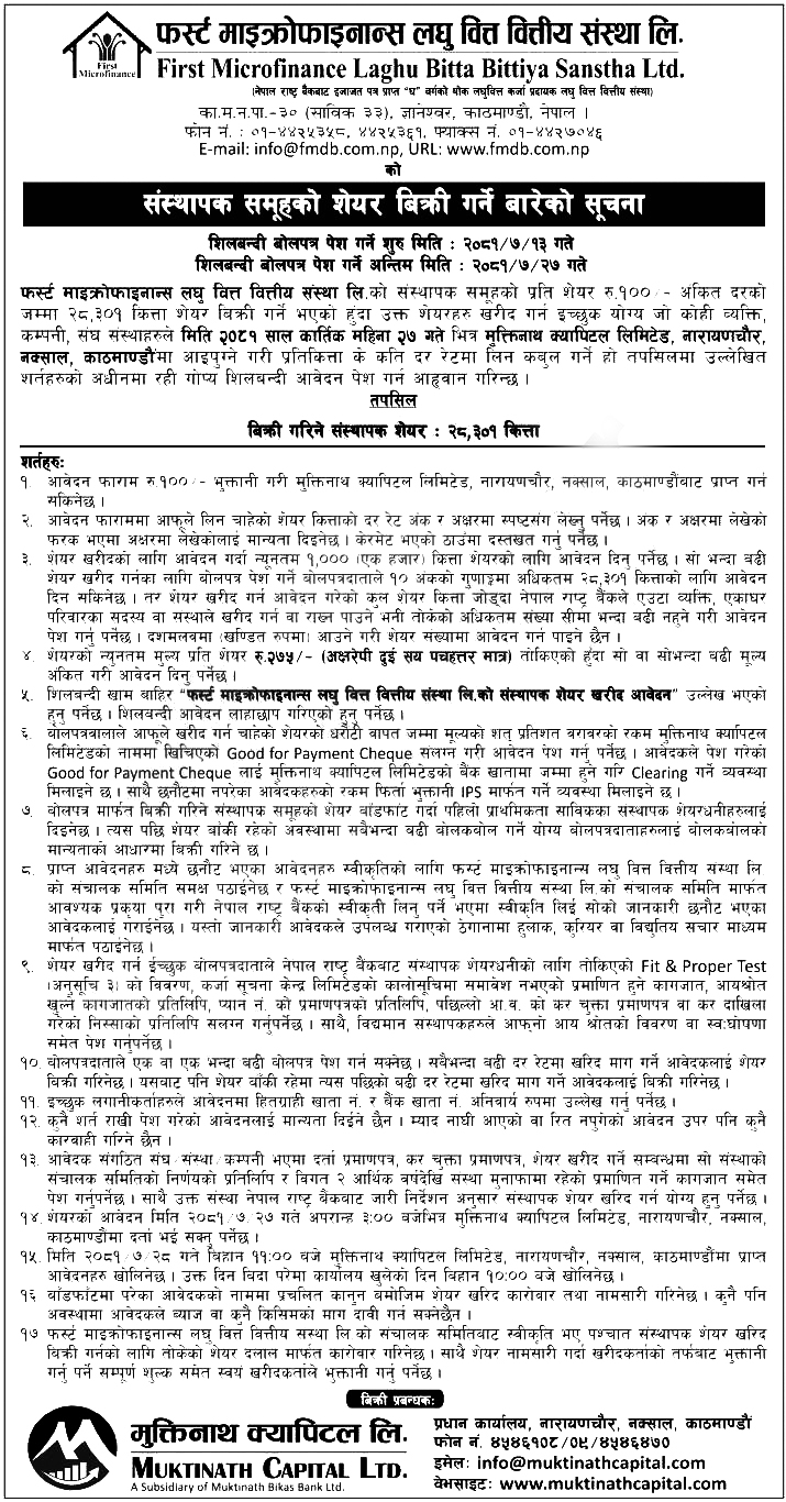 काठमाडौं । फर्स्ट माइक्रोफाइनान्स लघुवित्त वित्तीय संस्था लिमिटेडले संस्थापक शेयर बिक्रीमा राखेको छ । बैंकले संस्थापक समूहको २८ हजार ३०१ कित्ता शेयर बिक्रीमा राखेको हो ।