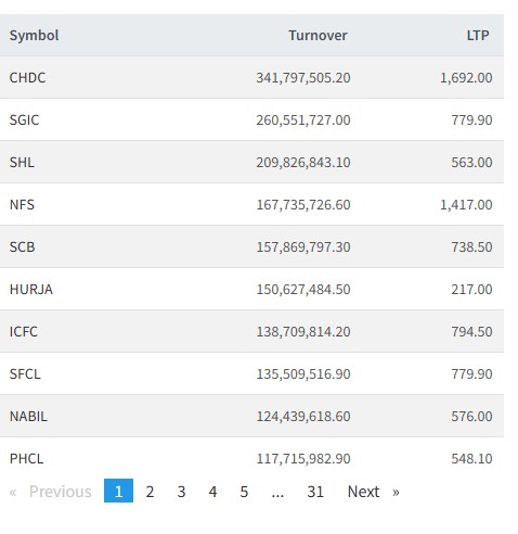 त्यस्तै, सानिमा जिआईसी, सोल्टि होटल, नेपाल फाइनान्स, स्टान्डर्ड च्यार्डड बैंक, हिमालयन उर्जा, आइसीएफसी, समृद्धि फाइनान्स, नबिल बैंक र पिपुल्स पावरको आज सर्वाधिक कारोबार भएको छ।
