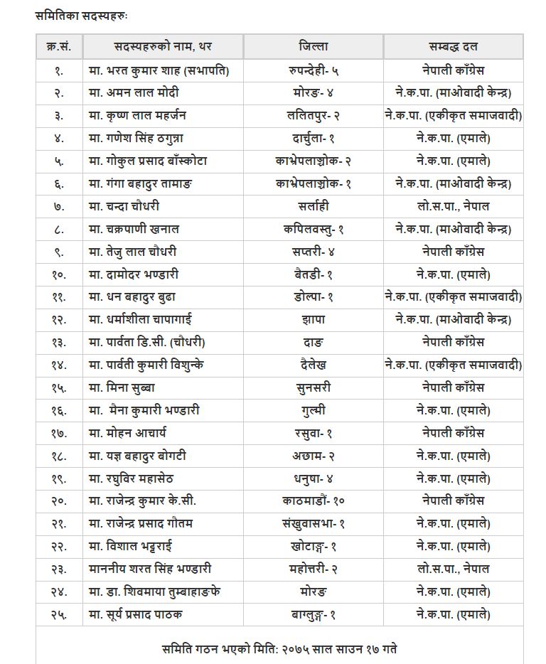 सञ्चार मन्त्रालय र मातहतका निकायको बेरुजु फस्र्योट उपसमितिको नेतृत्व भने माओवादी केन्द्रकी सांसद धर्मशिला चापागाईंले गरेकी थिइन् । कांग्रेसबाट भने संसदको सार्वजनिक लेखा तथा अर्थ समितिमा बसेर असाध्य चलखेल गर्ने कीर्तिपुरे राजन केसीसहित ६ जना सांसद समितिमा थिए । केसी अहिले पनि सरकारी उद्योगहरुको वर्गीकरण तथा नीजिकरण समितिमा सामेल छन् ।