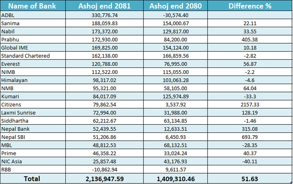 समिक्षा अवधिमा शेयर बजारबाट प्रभु बैंकले १७ करोड २९ लाख ३० हजार, ग्लोबल आइएमई बैंकले १६ करोड ९८ लाख २५ हजार, स्ट्याण्डर्ड चार्टर्ड बैंकले १६ करोड २१ लाख ३८ हजार, एभरेष्ट बैंकले १२ करोड ७ लाख ८८ हजार, नेपाल इन्भेष्टमेन्ट मेगा बैंकले १ करोड २५ लाख र हिमालयन बैंकले ९ करोड ८३ लाख १७ हजार रुपैयाँ आम्दानी गरेका छन् ।
