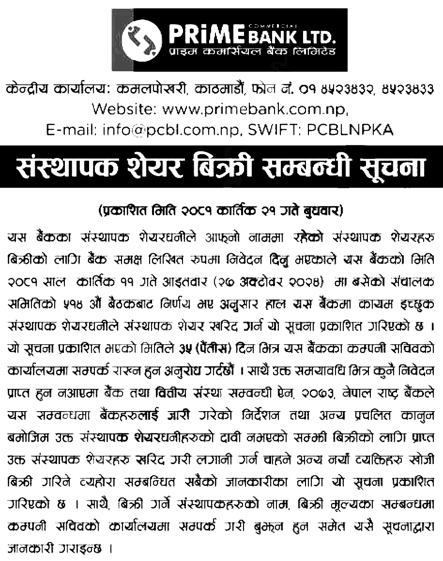 काठमाडौं । प्राइम कमर्सियल बैंक लिमिटेडले संस्थापक शेयर बिक्रीमा राखेको छ । बैंकले संस्थापक शेयरधनीको नाममा रहेको शेयर आजदेखि बिक्रीमा राखेको हो ।