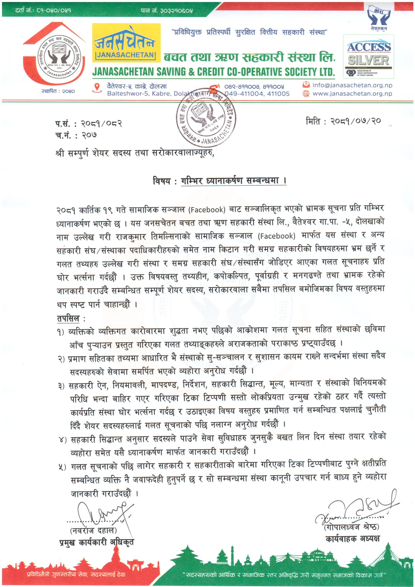जनसचेतनका प्रमुख कार्यकारी एवं सीईओ नवराज दहालले सामाजिक सञ्जालमा सार्वजनिक भएको सिपाडोल प्लटिङ सम्बन्धी बैना पट्टा काजगमा उल्लेख राजमजी दहाल संस्थाको साधारण सदस्य तथा ऋणी भएको स्वीकारेका छन् । उनले भनेका छन्, ‘सामाजिक सञ्जालमा पोष्ट्याइएको बैना पट्टा कागजमा जनसचेतनको नाम जोडिएको र त्यसमा उल्लेख रामजी दहाल हाम्रो साधारण सदस्य रहेको कुरा साँचो हो । तर, हाम्रा सदस्यहरुले संस्थाबाट ऋण लिएर लगानी गर्न सकिने कुरा नियम संगत नै छ । र, धितो मूल्याङ्कन भन्दा १०० प्रतिशत ऋण प्रवाह गरेको भनी गरिएको प्रचार गलत हो । हामीले राष्ट्र बैंकको निर्देशन बमोजिम नै पहाडी क्षेत्रमा धितोको कुल मूल्याङ्कनको ४० प्रतिशत भन्दामाथि ऋण प्रवाह गरेका छैनौं ।’