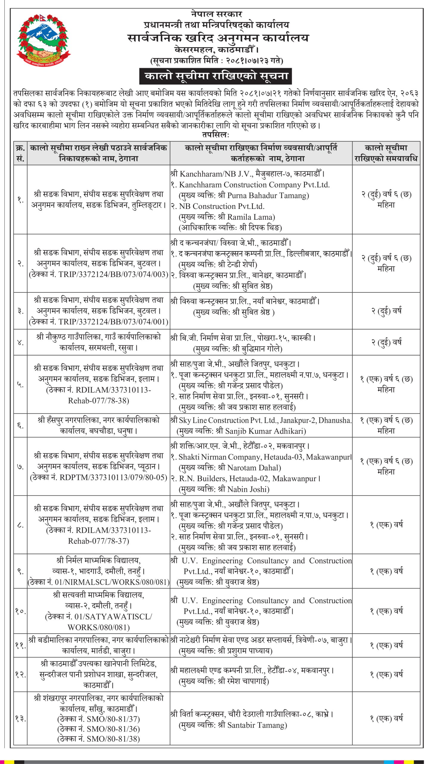 यस्तै, बुद्धिमान गोले मुख्य व्यक्ति भएको बीजी निर्माण सेवा प्रालि पोखरा, गजेन्द्रप्रसाद पौडेल मुख्य व्यक्ति भएको पूजा कन्स्ट्रक्सन धनकुटा र जयप्रकाश साह हलवाई मुख्य व्यक्ति भएको साह निर्माण सेवा इनरुवा पनि कालोसूचीमा परेका छन् ।