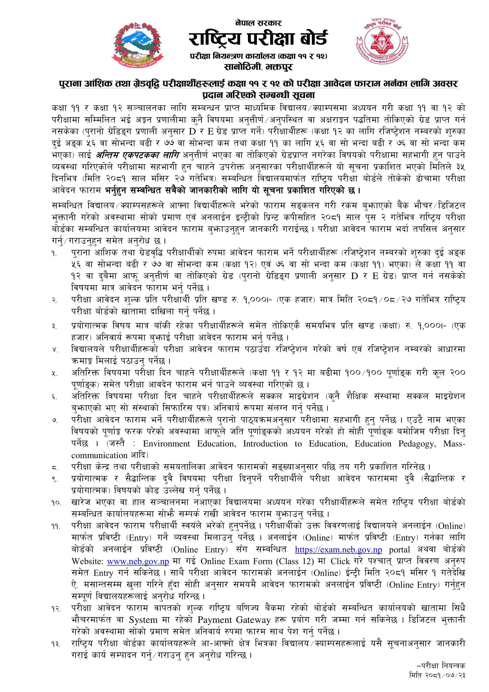 राष्ट्रिय परीक्षा बोर्डले सूचना प्रकाशन गर्दै २५ वर्षअघि ११ र १२ मा भर्ना भई फेल भएका परीक्षार्थीलाई अन्तिम मौकास्वरूप एकपटक परीक्षा दिन पाउने व्यवस्था गरिएको जानकारी दिएको छ।
