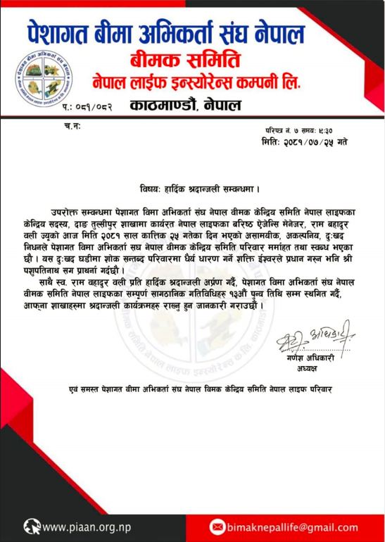 पेशागत बीमा अभिकर्ता संघ बीमक समिति नेपाल लाइफका अध्यक्ष गणेश अभिकारीले पनि बिज्ञप्तिमार्फत वलीको निधनमा शोक व्यक्त गरेका छन् । अध्यक्ष अधिकारीले पेशागत बीमा अभिकर्ता संघ नेपाल लाइफ बीमक समितिले १३ दिनसम्म वलीको निधनमा शोक मनाउने निर्णय गरेको जनाएका छन् ।