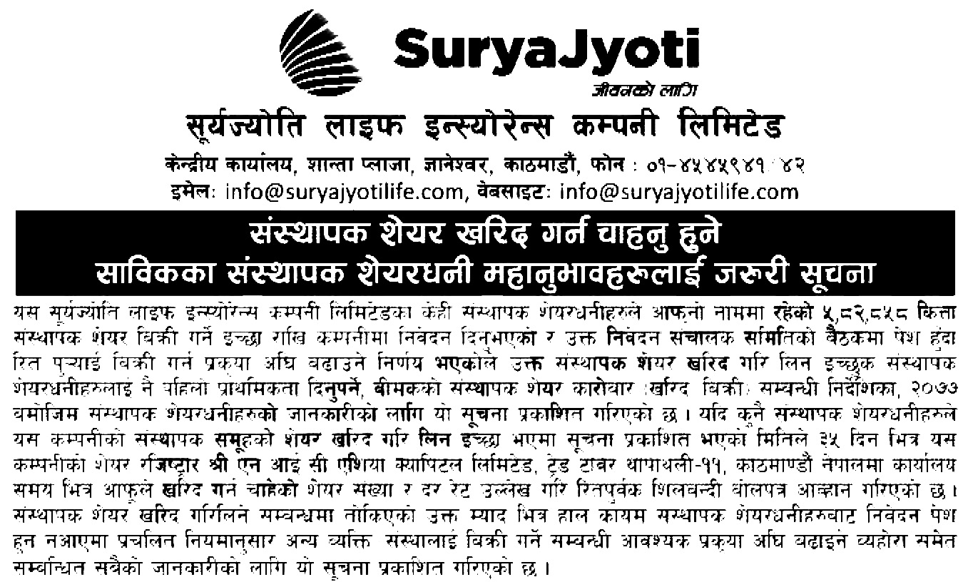 काठमाडौं । सूर्यज्योति लाइफ इन्स्योरेन्स कम्पनी लिमिटेडले संस्थापक शेयर बिक्रीमा राखेको छ। कम्पनीले केही संस्थापक शेयरधनीहरूको नाममा रहेको ५ लाख ८२ हजार ८५८ कित्ता शेयर बिक्रीमा राखेको हो।