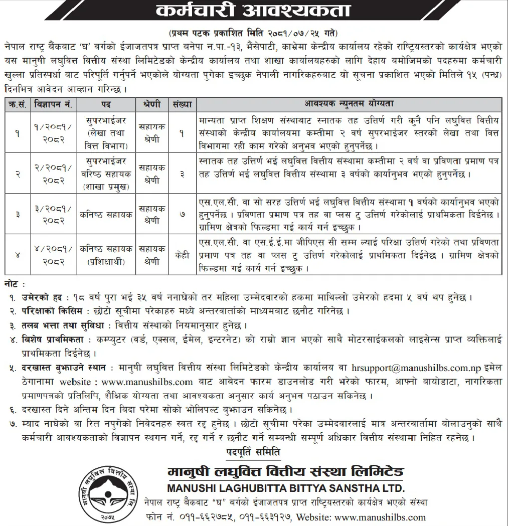 मानुषी लघुवित्तद्वारा ४ पदमा कर्मचारी माग, एसएलसी पासलाई पनि मौका