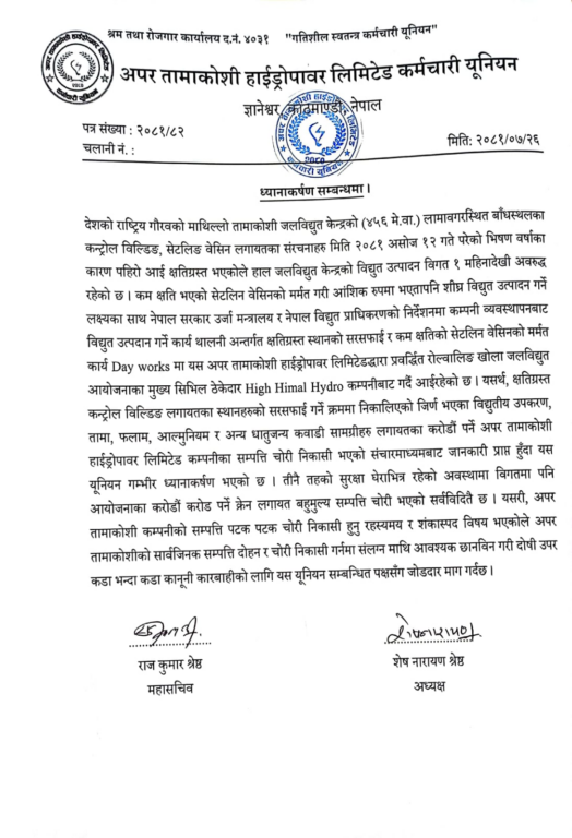 सोमबार जारी गरिएको ध्यानाकर्षण पत्रमा युनियनले यी बहुमूल्य सामग्रीहरू रहस्यमयी तरिकाले गायब भएको भन्दै चोरीमा संलग्न दोषीहरूमाथि कडा कारबाही गर्न माग गरेको छ। युनियनका अनुसार, आयोजनामा तीन तहको सुरक्षा घेराभित्र रहँदा पनि यसअघि करोडौंको क्रेन र अन्य बहुमूल्य सामग्रीहरू चोरी भएका थिए, जसले आयोजना सुरक्षामाथि गम्भीर प्रश्न उठाएको छ।