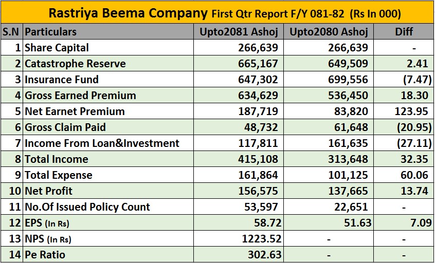 नाफा वृद्धि भएसँगै कम्पनीको प्रतिशेयर आम्दानी (ईपीएस) पनि वृद्धि भएको छ। गत आवको प्रथम त्रैमासमा कम्पनीको प्रतिशेयर आम्दानी ५१ रुपैयाँ ६३ पैसा रहेकोमा चालू आवमा बढेर ५८ रुपैयाँ ७२ पैसा पुगेको छ। त्यस्तै, कम्पनीको प्रतिशेयर नेटवर्थ १ हजार २२३ रुपैयाँ ५२ पैसा छ।