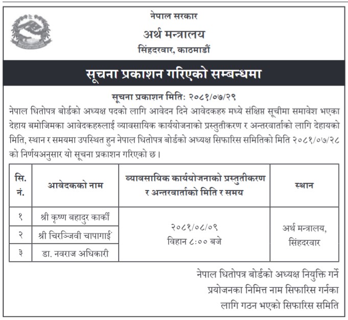 बोर्डको अध्यक्ष पदका लागि प्रारम्भिक छनोटमा परेका नेपाल स्टक एक्सचेन्जका प्रमुख कार्यकारी अधिकृत (सीईओ) कृष्ण बहादुर कार्की, बीमा समितिका पूर्वअध्यक्ष चिरञ्जीवी चापागाईँ र सेबोनका कार्यकारी निर्देशक नवराज अधिकारीलाई व्यावसायिक कार्य योजना प्रस्तुतीकरण सहित अन्तरवार्तामा बोलाइएको छ ।