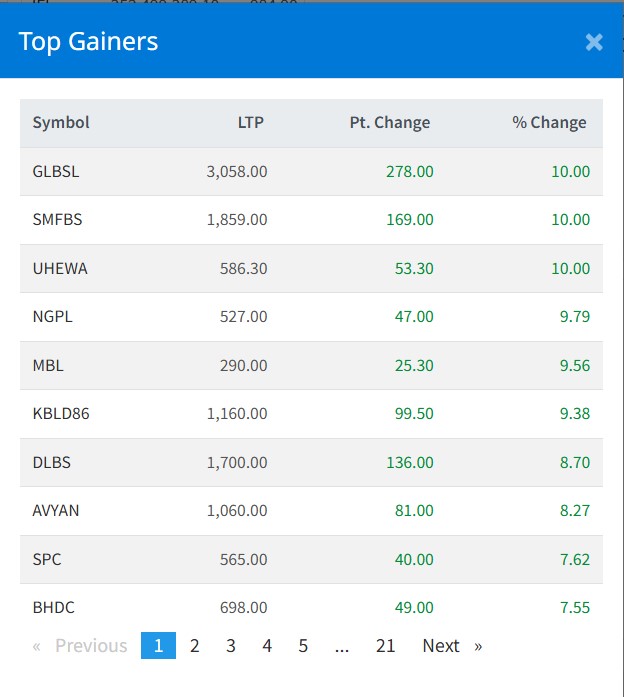 साथै, ङादी ग्रूप पावरको शेयरमूल्य ९.७९ प्रतिशत, माछापुच्छ्रे बैंकको ९.५७ प्रतिशत लगायतले शेयरमूल्य बढेको छ ।