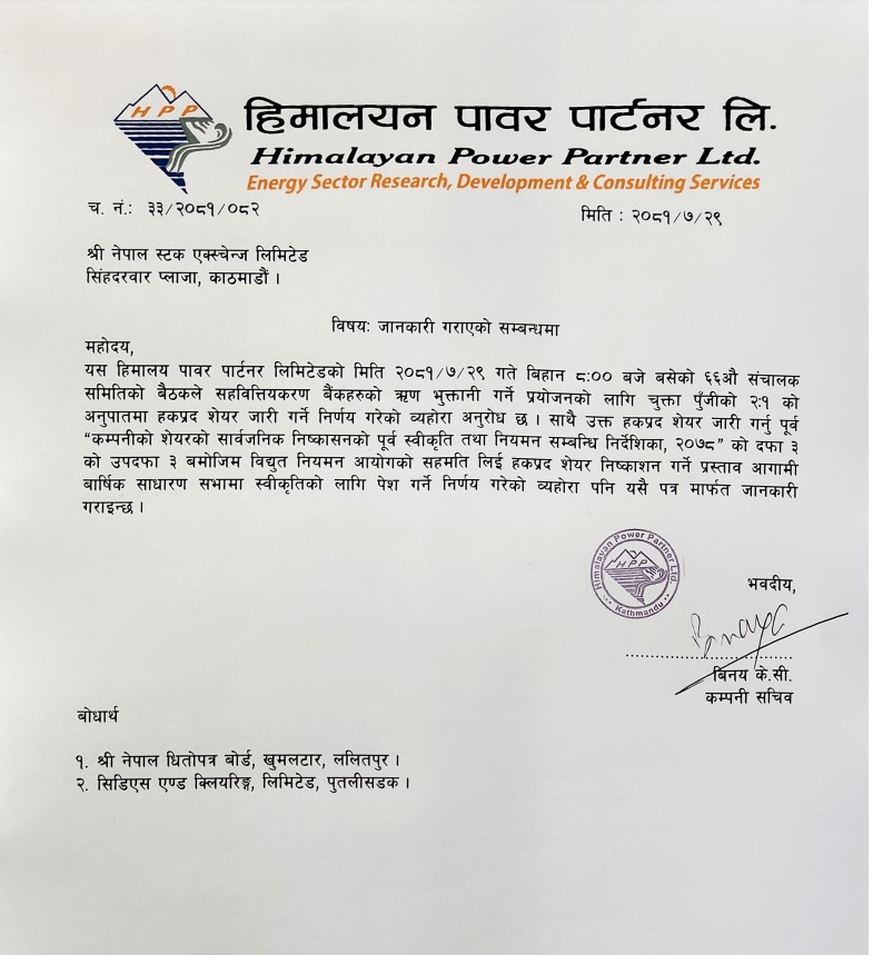 हिमालयन पावर पार्टनरले हकप्रद जारी गर्ने