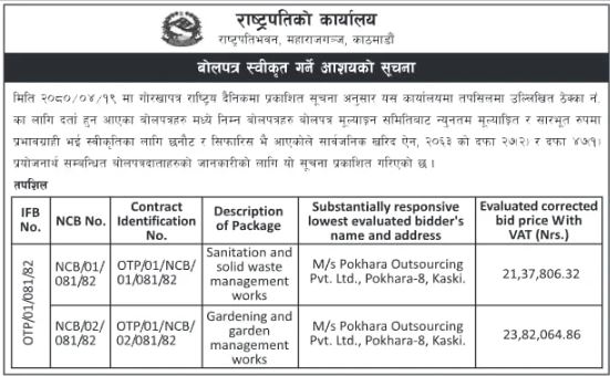 शीतल निवासको बगैँचा तथा सरसफाइ व्यवस्थापनका लागि थप प्रभावकारी र सौन्दर्यपूर्ण बनाउने उद्देश्यले गरिएको यस ठेक्काले आगामी दिनमा राष्ट्रपतिको कार्यालयको सरसफाइ र व्यवस्थापनमा योगदान पुर्याउने अपेक्षा गरिएको छ।