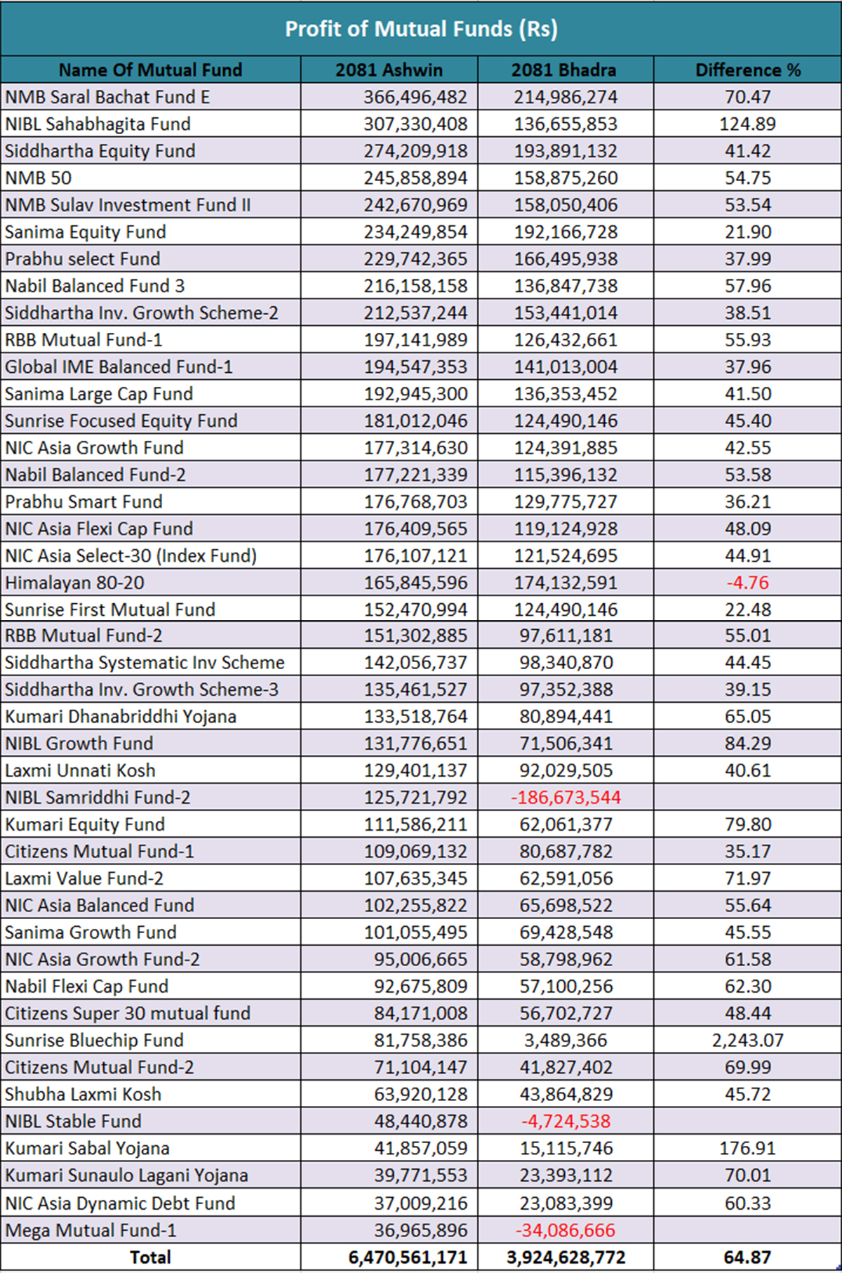असोज महिनामा संचालनमा रहेका ४३ वटा म्युचुअल फन्डहरूको विवरण अनुसार, कुल ६ अर्ब ४७ करोड ५ लाख ६१ हजार रुपैयाँको खुद नाफा आर्जित भएको छ, जुन अघिल्लो भदौ महिनाको तुलनामा ६४.८७ प्रतिशतले वृद्धि भएको हो। भदौमा म्युचुअल फन्डहरूको नाफा ३ अर्ब ९२ करोड ४६ लाख रुपैयाँ मात्र थियो।
