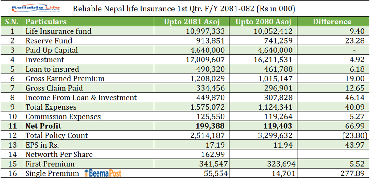 तीन महिनाको अवधिमा कम्पनीको दाबी भुक्तानी १२.६५ प्रतिशतले बढेको छ भने लगानी तथा कर्जा ४६ प्रतिशतले बढेको छ । ४ अर्ब ६४ करोड रुपैयाँ चुक्ता पूँजी रहेको यस कम्पनीको प्रतिशेयर आम्दानी १७ रुपैयाँ १९ पैसा छ ।