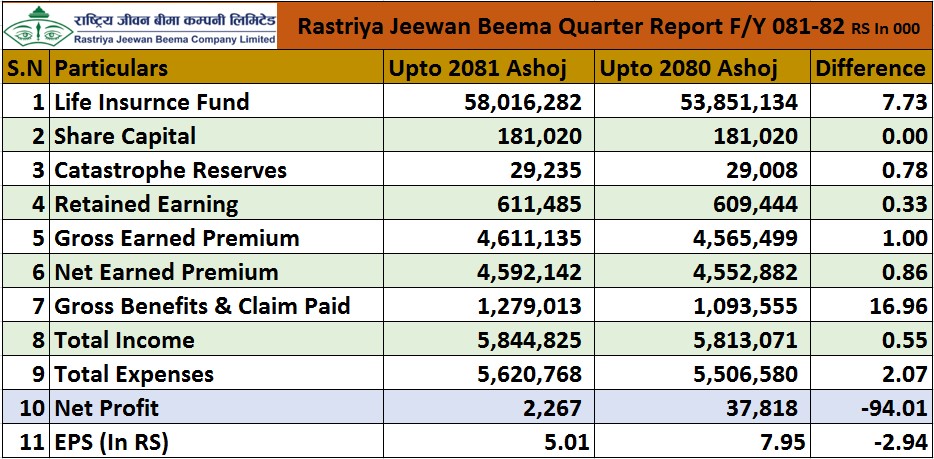 कम्पनीले चालू आवको असोज मसान्तसम्म ४ अर्ब ५९ करोड रुपैयाँ खुद बीमाशुल्क आर्जन गरेको छ। गत आवको यसै समयमा कम्पनीले ४ अर्ब ५५ करोड रुपैयाँ खुद बीमाशुल्क आर्जन गरेको थियो। कम्पनीको जीवन बीमा कोषमा ५८ अर्ब रुपैयाँभन्दा बढी रकम छ।