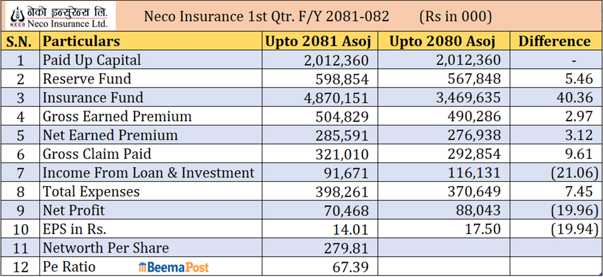 नेको इन्स्योरेन्सको मुनाफा ७ करोडमाथि, कुल बीमा शुल्क आर्जन साढे ५० करोड