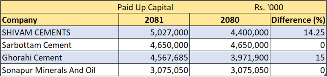 चुक्तापुँजी धेरै हुनेमा शिवम सिमेन्ट पहिलो नम्बरमा रहेको छ । चालु आर्थिक वर्षको असोज मसान्तसम्ममा कम्पनीको चुक्तापुँजी ५ अर्ब २ करोड ७० लाख रुपैयाँ रहेको छ । जुन अघिल्लो आर्थिक वर्षको तुलनामा १४.२५ प्रतिशतले बढी हो ।