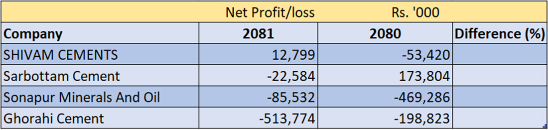 सर्वोत्तम सिमेन्ट २ करोड २५ लाख, सोनापुर ८ करोड ५५ लाख र घोराही सिमेन्ट ५१ अर्ब ३७ करोड रुपैयाँ ऋणात्मक रहेको छन् ।