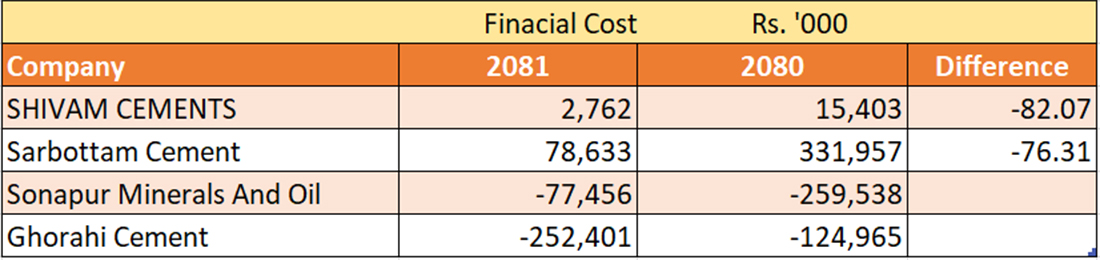 वित्त खर्च शिवम सिमेन्टको २७ लाख, सर्वोत्तमको ७ करोड ८६ लाख, सोनापुरको ७ करोड ७४ लाख ऋणात्मक र घोराहीको २५ करोड ऋणात्मक रहेको छ ।