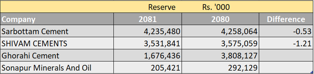 यता, शिवम सिमेन्टको ३ अर्ब ५३ करोड, घोराही सिमेन्टको १ अर्ब ६७ करोड र सोनापुरको २० करोड रुपैयाँ जगेडा कोषमा रहेको छ ।
